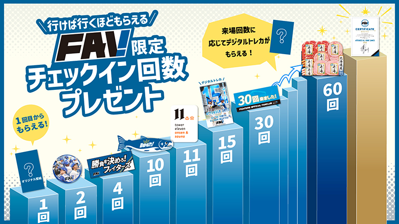 エスコンフィールドやFビレッジ内でのお買い物、イベント参加などで、さまざまなデザインの「デジタルバッジ」を獲得できます。>詳細はこちら